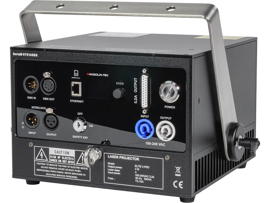 An FB4 equipped laser light show projector is one that has Pangolin’s FB4 control hardware integrated inside of the projector itself.